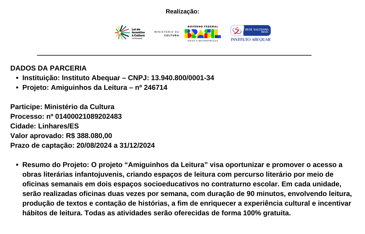 O projeto “Amiguinhos da Leitura” visa oportunizar e promover o acesso a obras literárias infantojuvenis,
