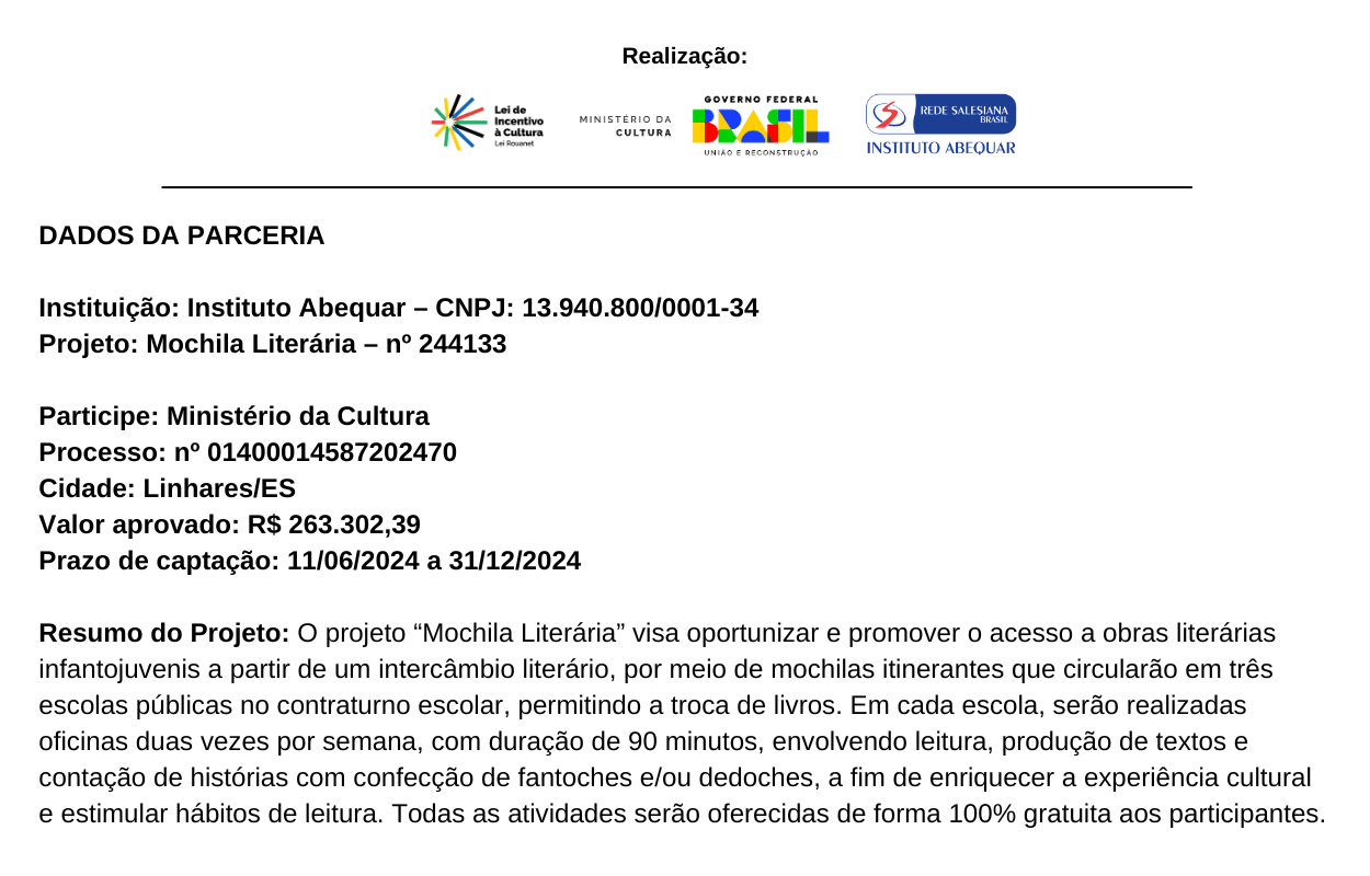 O projeto “Mochila Literária” visa oportunizar e promover o acesso a obras literárias infantojuvenis a